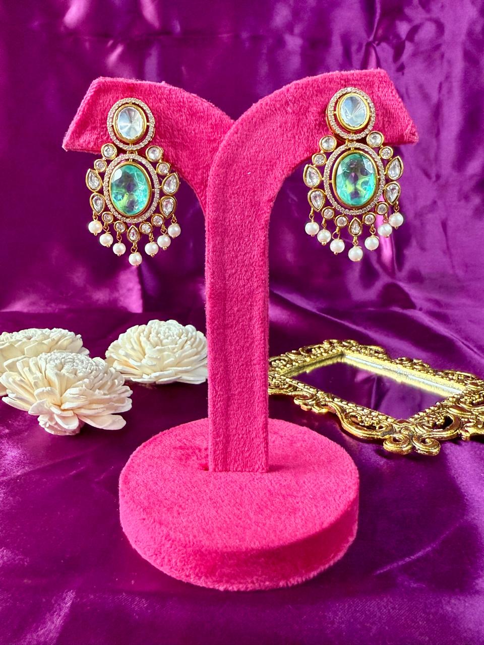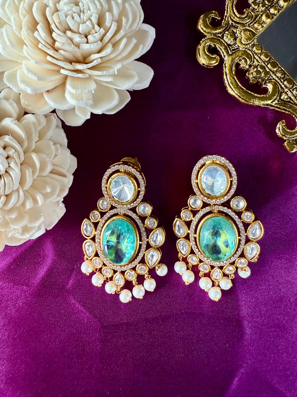 Delicately ornate, these Polki danglers bring a touch of regal charm with their flowing silhouette. Ideal for adding grace and grandeur to any festive ensemble.