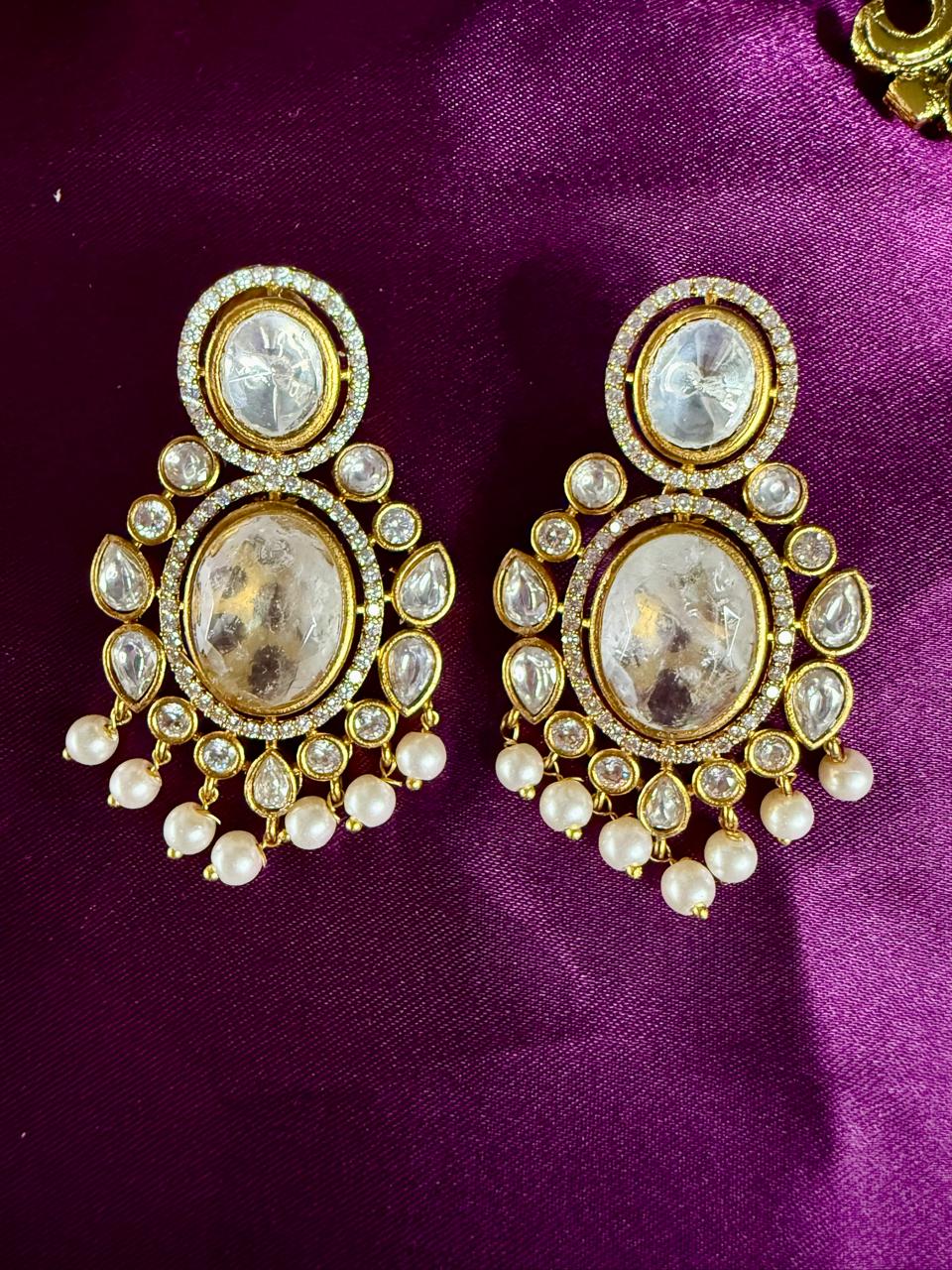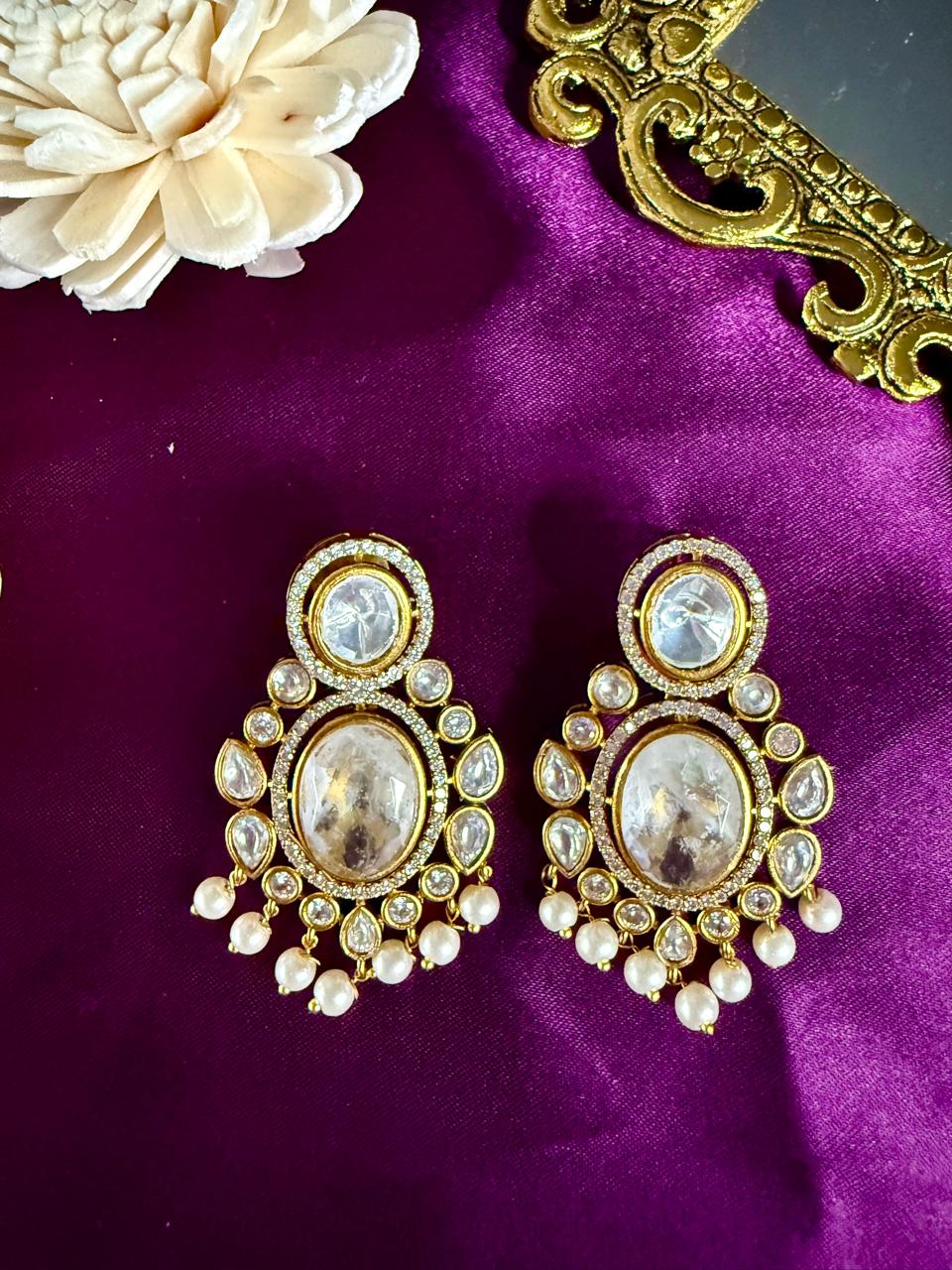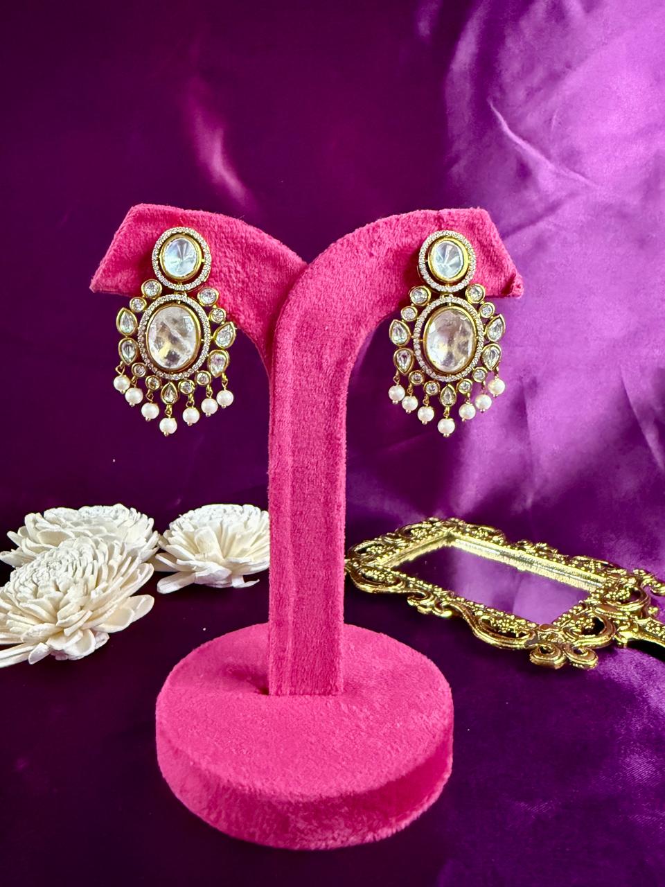 Delicately ornate, these Polki danglers bring a touch of regal charm with their flowing silhouette. Ideal for adding grace and grandeur to any festive ensemble.