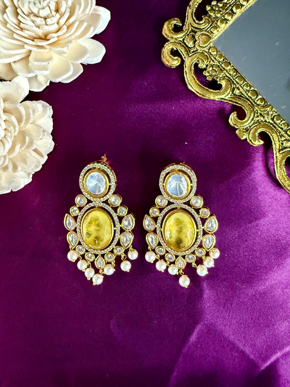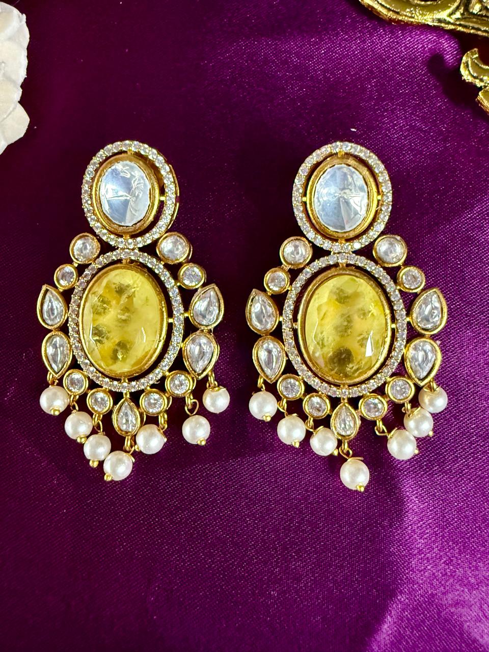 Delicately ornate, these Polki danglers bring a touch of regal charm with their flowing silhouette. Ideal for adding grace and grandeur to any festive ensemble.